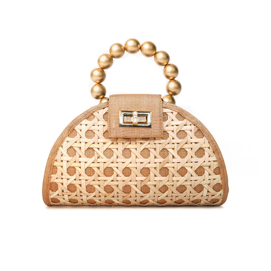 THE ISABELLA Tan Rattan Solihiya Weave and Gold Bead Top Handle Statement Bag