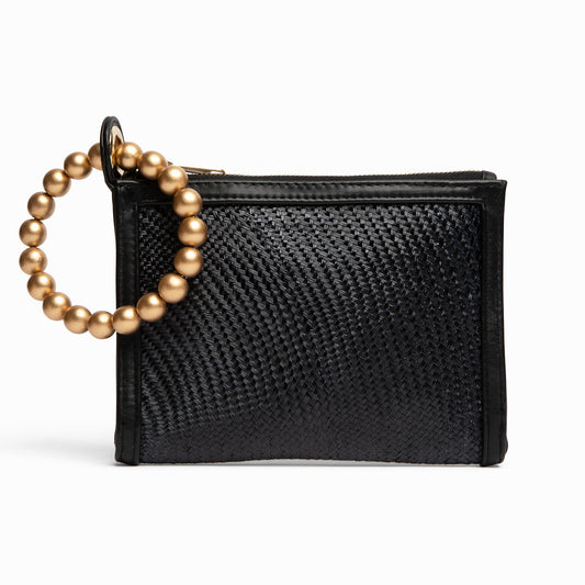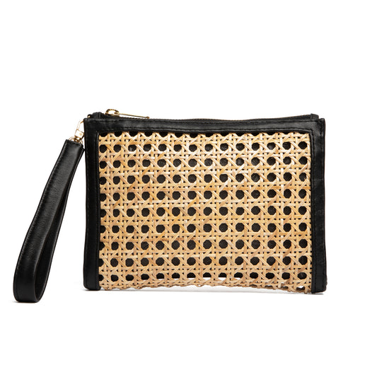 THE EMILY Black Leather & Natural Rattan Woven Wristlet Pouch