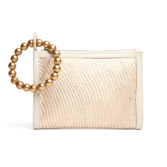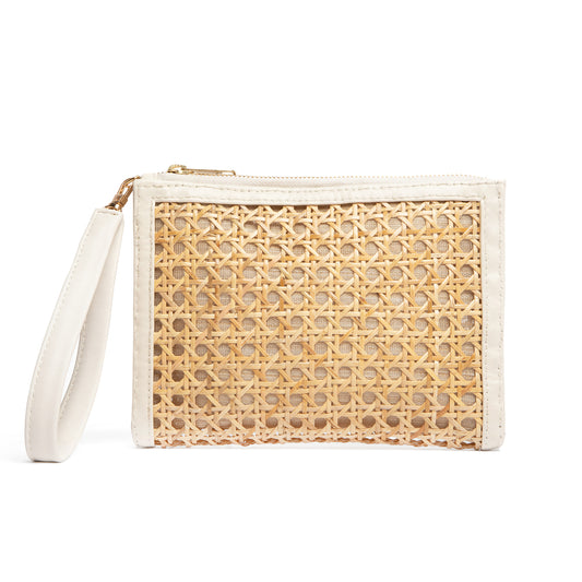 THE EMILY Cream Leather & Natural Rattan Woven Wristlet Pouch