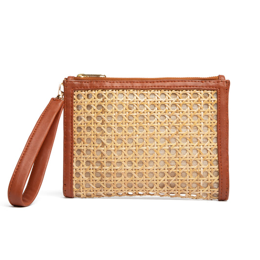 THE EMILY Tan Leather & Natural Rattan Woven Wristlet Pouch